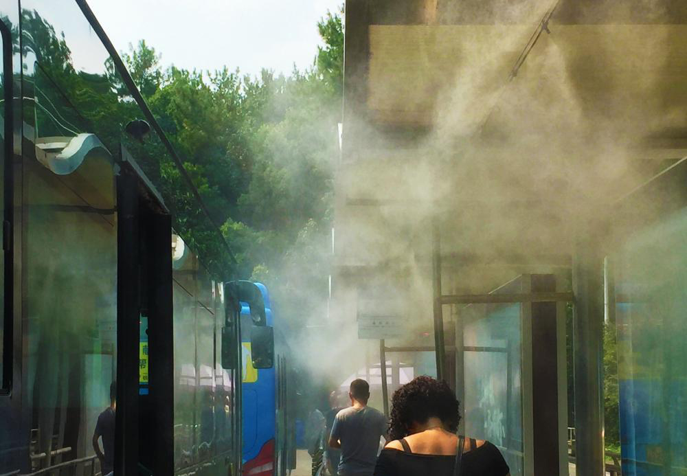 杭州靈隱公交站,“噴霧降溫系統(tǒng)”,在炎炎夏日為候車乘客送上一絲清涼,乘客贊不絕口。
