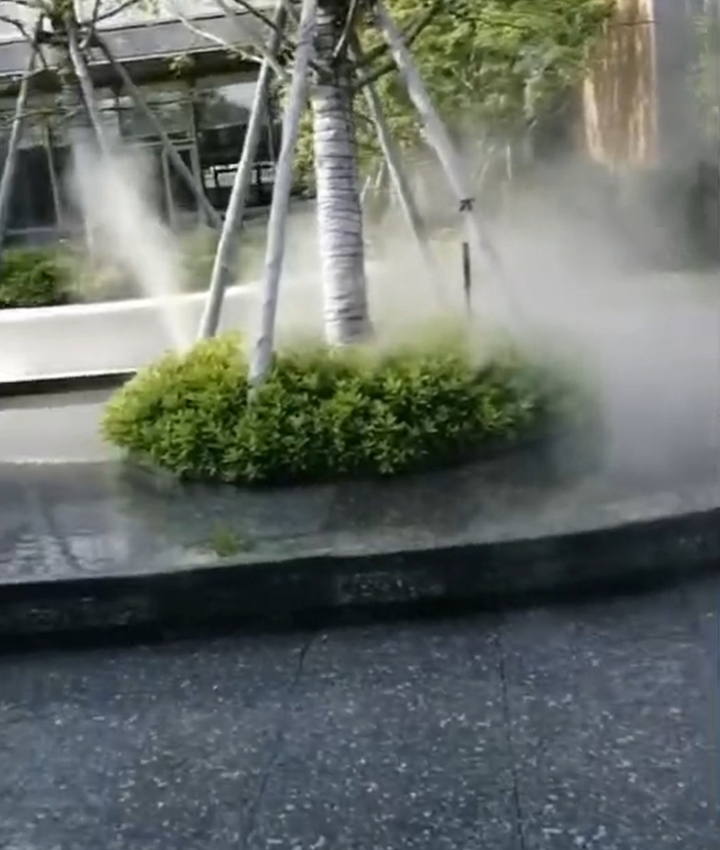 安裝室外噴霧造景設(shè)備,共計180個噴頭。為夏天的炎熱送去一絲涼意。